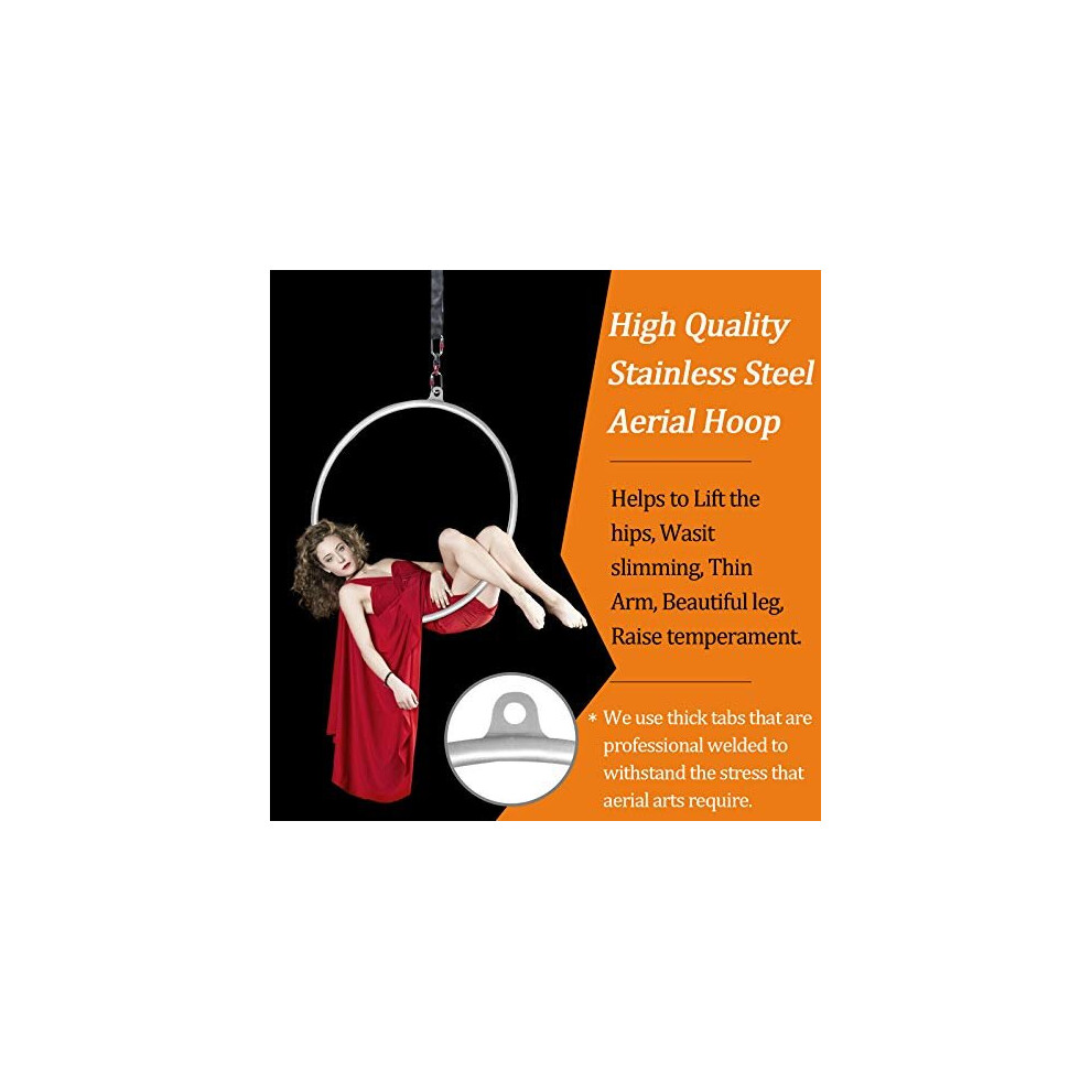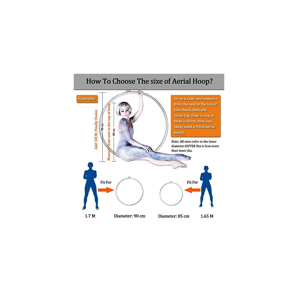 PREMIUM AERIAL RING WITH ACCESSORIES: Our Aerial Hoop made of high quality stainless steel with powder coating, durable and anti-rust. We use thick tabs that are professional welded to withstand the stress that aerial arts require. With 25M length antiskid tape to wind the aerial acrobatic hoop so that will not hurt hand. Heavy-duty accessories can bear higher strength: One 1M Spanset (Load-bearing 2 Tons), Three D-ring(Max strength 25KN) and One 360 Roatation Swivel(Max strength 30KN). HOW TO CHOOSE SIZE: We have 4 different sizes as customer choices: 85CM/33.46" and 90CM/35.43" for the diameter of the hoop, and 25MM/0.98" and 32MM/1.26" for the aerial ring bar. If you are unsure which size you need, a basic measurement is to sit on a chair and measure from the seat to the top of your head, then add 10cm (eg: chair to top of head is 80cm, then you likely need a 90cm aerial hoop). Note: this refer to the INNER diameter.OUTER Dia is 5cm more than INNER dia. SINGLE POINT AERIAL RING, MORE CHALLENGING: Normally, there are one point aerial ring and double point aerial ring. However, single point aerial ring has more instability than double point one. High instability means much more challenge to aerialists. COMES WITH PERFECT STORAGE BAG: Don't worry what will be used to store it! Easy to take anywhere. Manual included, easy to install. Great Performance for Aerialists, Design to make you stronger and have better body shape. Headstand on the aerial hoop set is good for blood circulation so as to make your skin more glow and smooth. Helps to thin arm, waist, leg and lift hips and so forth. WIDELY USE: The Aerial dance equipment, capacity up to 660LBS. Widely used in home, dancing studio, gym, and performing place. Has more than one setup ways. Suitable for men and women. Aerial Hoop is specifically designed for professional aerial dance and aerial acrobatics.